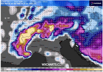 Inoltre, l’assenza di un minimo depressionario al suolo ben strutturato e posizionato in prossimità del Mar Ligure o dell’alto Tirreno, elemento imprescindibile per rallentare e approfondire il sistema perturbato, impedirà un’adeguata risalita di umidità nei bassi strati padani. Ne consegue una scarsissima possibilità di precipitazioni significative in pianura, con precipitazioni che secondo ECMWF si concentreranno esclusivamente sulle zone alpine, specie in Valle d’Aosta, dove la quota neve resterà sufficientemente bassa da garantire accumuli anche a fondovalle.
