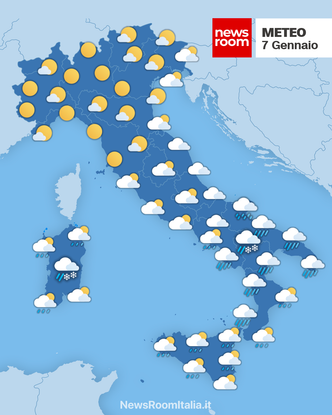 Centro Italia e Sardegna: La pressione debole favorisce condizioni atmosferiche instabili al Centro e sulla Sardegna. Saranno ampiamente coperti i settori adriatici con nevicate sino a quote prossime alla costa su Marche e Abruzzo, specie nelle prime ore della giornata. Sul Lazio si avranno rovesci sparsi mentre sulle altre zone del Centro il cielo si presenterà più soleggiato, con progressivo miglioramento sulle Marche e Abruzzo nel pomeriggio. La Sardegna vedrà una giornata con pioggia mista a neve sulle zone collinari e alternanza di schiarite, accompagnata da temperature contenute tra 5 e 8 gradi nelle maggiori città. I venti moderati da ovest e nord-ovest rinforzeranno la sensazione di freddo.