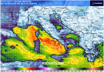 A partire da Sabato, il sistema ciclonico tenderà a traslare verso Sud-Est, innescando una rotazione dei venti dai quadranti settentrionali. È atteso così l’arrivo del Maestrale, vento più freddo e impetuoso, che dapprima colpirà la Sardegna per poi estendersi rapidamente a gran parte del Centro-Sud e dell’Adriatico. Le raffiche, anche in questo caso, potranno superare i 90 km/h, con rischio concreto di mareggiate violente sui litorali esposti, in particolare lungo le coste occidentali della Sardegna, del Lazio, della Campania e sulla Sicilia settentrionale.