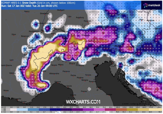 Il fronte perturbato abbandonerà rapidamente il Nord-Ovest nel corso della notte su Martedì 20 gennaio, favorendo un miglioramento delle condizioni meteo. Tuttavia, la coda del sistema interesserà parte dell’Appennino centrale e meridionale, con possibilità di nevicate al di sotto dei 1000 metri sull’Appennino tosco-emiliano e fin verso i 700-800 metri tra Basilicata e Calabria. Sull’Etna sono attese nevicate abbondanti oltre i 1800 metri, con accumuli superiori al metro a quote elevate.