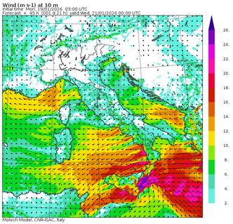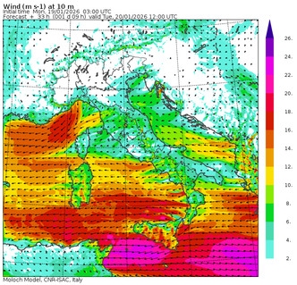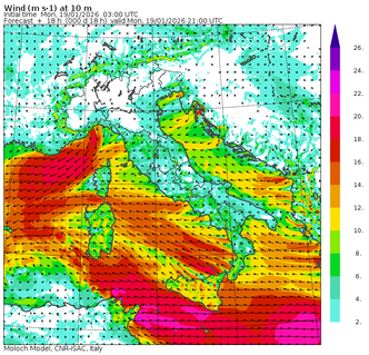 L’evoluzione prevista è però ben più severa: il modello MOLOCH del CNR, che elabora simulazioni ad alta risoluzione, indica per domani raffiche prossime o superiori ai 150 km/h tra la Sicilia sud-orientale e lo Jonio calabrese, in particolare tra le province di Siracusa, Reggio Calabria e Catania.