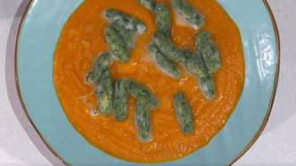 - Per la presentazione, distribuite la crema di zucca calda nei piatti e adagiatevi sopra gli gnocchetti di pane ben conditi. Completate con un rametto di timo fresco per decorare e servite subito.