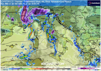 Il punto di svolta si concretizzerà venerdì 23 gennaio, quando la nuova perturbazione, sospinta da correnti sud-occidentali, impatterà con decisione sulle regioni di Nord-Ovest. Il contesto termico, ancora influenzato dalle sacche di aria fredda intrappolate nei bassi strati atmosferici risulterà determinante nel favorire precipitazioni nevose a quote molto basse. In Piemonte si potranno osservare fiocchi di neve fino in pianura, in particolare tra Torinese, Cuneese e Astigiano. In Lombardia ed Emilia occidentale, la neve cadrà inizialmente a quote collinari, con possibili sconfinamenti fino alle basse quote sui settori più settentrionali e occidentali. Sulle Alpi, le precipitazioni assumeranno carattere nevoso fin da subito, con accumuli anche significativi lungo l’intero arco alpino centro-occidentale.
