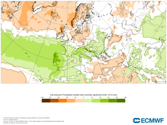 A livello emisferico, si delinea un’importante riorganizzazione del pattern atmosferico, con la ripresa di uno scambio meridiano più marcato e l’inserimento di saccature depressionarie capaci di penetrare nel bacino del Mediterraneo centrale. Tale dinamica potrebbe generare un surplus pluviometrico significativo, soprattutto sulle regioni del Centro-Nord, dove le precipitazioni, secondo le medie settimanali previste dal modello europeo, si attesterebbero oltre il 120-130% rispetto ai valori climatologici di riferimento.