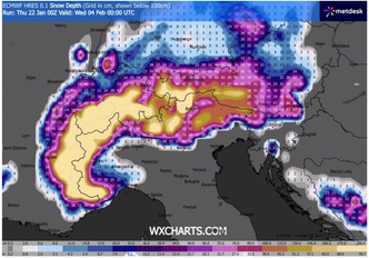 Le proiezioni a medio termine, basate sui principali modelli numerici (ECMWF, GFS), indicano un’intensa attività ciclonica sul comparto europeo centro-occidentale fino alla prima settimana di febbraio. Le mappe di precipitazione cumulata mostrano valori superiori ai 100 mm su vaste aree alpine, che si tradurranno interamente in neve sopra i 1200–1400 metri. Nord-ovest, Prealpi e settore orientale alpino saranno le zone più interessate dalle nevicate, fino almeno al 5 febbraio.