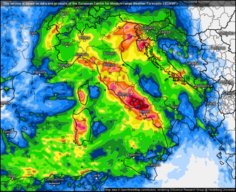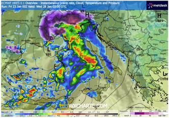 Contemporaneamente, le regioni nord-orientali e la pianura Padana centro-orientale saranno interessate da piogge diffuse e localmente intense, con accumuli idrici consistenti entro il termine dell’evento. Il contrasto termico indotto dal fronte freddo sarà responsabile anche di una spiccata ventilazione: venti tesi di libeccio e successivamente di maestrale spazzeranno il versante tirrenico, con raffiche che nelle aree esposte potranno superare i 70-80 km/h.