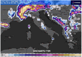 Sull’arco alpino si prevede una fase nevosa particolarmente proficua, con precipitazioni che interesseranno inizialmente i settori occidentali per poi estendersi, nel corso di mercoledì 28 gennaio, a tutto il comparto centro-orientale. La quota neve si collocherà generalmente intorno ai 600-700 metri, ma nei momenti di maggiore intensità precipitativa potrà localmente scendere fino ai 500 metri, soprattutto nei fondovalle chiusi e ben esposti al travaso freddo. Gli accumuli più rilevanti si registreranno al di sopra dei 1000 metri, con valori compresi tra 30 e 40 cm di neve fresca, localmente anche superiori nei comprensori sciistici del Piemonte, della Valle d’Aosta e delle Dolomiti centro-settentrionali. Il Trentino-Alto Adige, il Veneto e il Friuli-Venezia Giulia beneficeranno anch’essi di apporti consistenti, grazie a un efficace richiamo umido da sud che favorirà lo sbarramento orografico e l’intensificazione delle precipitazioni.