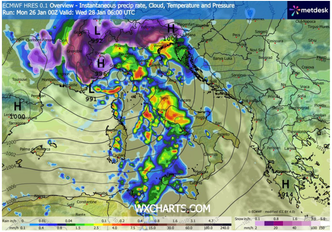 Un’importante irruzione di aria fredda di origine artica-marittima è pronta a investire l’Italia a partire dalla serata di martedì 27 gennaio, dando origine a una fase perturbata di marcata intensità che interesserà progressivamente gran parte della Penisola. Il cuore della dinamica sinottica sarà una vasta depressione in discesa dal Nord Atlantico, in grado di attivare un deciso richiamo di correnti umide sud-occidentali nei bassi strati, in contrasto con l’ingresso retrogrado di masse d’aria fredda in quota. Il risultato sarà una netta flessione delle temperature e un ritorno a condizioni pienamente invernali, con nevicate anche a bassa quota e accumuli significativi sulle aree montane.