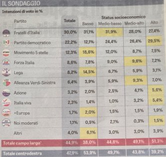 Un discorso analogo vale per Alleanza Verdi Sinistra, che registra il suo picco di consensi (9,3%) nella fascia medio-alta e scende al 3,9% tra i meno abbienti. I numeri confermano che l’ecologismo e il progressismo radicale attirano ormai soprattutto chi ha già raggiunto una certa stabilità economica. E nella stessa direzione si muovono Azione e Italia Viva, rispettivamente al 5,6% e al 5,4% nella fascia più alta, ben oltre la loro media nazionale.