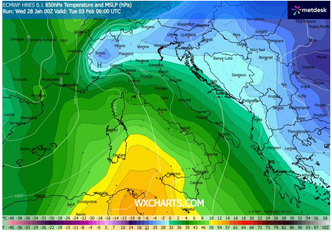 Il fenomeno è legato a una dinamica barica piuttosto classica per la stagione, con l’alta pressione in temporaneo arretramento sull’Europa centrale e l’affondo di una saccatura atlantica che richiama verso il Mediterraneo centrale masse d’aria subtropicali. Laddove queste riescono a penetrare più facilmente, ossia al Centro-Sud, il riscaldamento è evidente; mentre il Nord, chiuso tra Alpi e correnti continentali, rimane in una sacca di freddo stagnante.