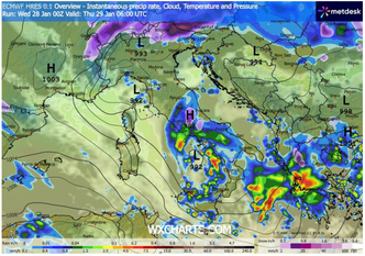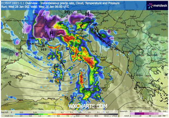 Nella giornata di martedì 27 gennaio, la perturbazione ha raggiunto le regioni nord-occidentali per poi estendersi nel corso della notte a tutto il Nord e progressivamente al Centro Italia. Le condizioni meteo si sono ulteriormente complicate con l’approfondimento del minimo barico, il cui asse si sta spostando verso le regioni settentrionali, favorendo un peggioramento significativo anche lungo il versante tirrenico centrale e meridionale.