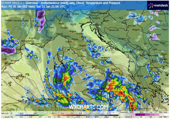 Il nuovo vortice depressionario si approfondirà rapidamente sul basso Tirreno, con un minimo barico stimato al di sotto dei 995 hPa: un valore significativo, indice di una circolazione ciclonica ben strutturata e associata a forti venti ciclonici, precipitazioni diffuse e soprattutto moto ondoso in marcata intensificazione. L’episodio, seppur di durata relativamente breve, concentrato tra il pomeriggio di sabato e le prime ore di domenica, sarà in grado di generare un’ondata di maltempo marina di rilievo, con onde che localmente raggiungeranno i 6 metri di altezza.