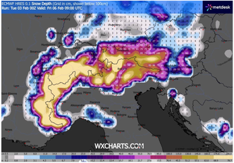 Le giornate chiave saranno mercoledì 4 e venerdì 6 febbraio. Il primo peggioramento, atteso mercoledì, porterà nuove nevicate a partire dagli 800-900 metri, con accumuli significativi soprattutto nei settori orientali dell’arco alpino e su tutto il Triveneto. In queste aree si prevedono apporti freschi compresi tra i 30 e i 40 cm in poche ore, grazie a precipitazioni persistenti e localmente intense. Dopo una temporanea pausa più asciutta nella giornata di giovedì 5, un nuovo fronte raggiungerà le Alpi a partire da ovest nel corso della mattinata di venerdì, per poi spostarsi rapidamente verso est nel corso della sera. L’afflusso di correnti sciroccali determinerà un lieve rialzo della quota neve, che si porterà intorno ai 900-1000 metri, ma gli apporti previsti restano significativi: ulteriori 20-30 cm di neve fresca sono attesi entro fine giornata.