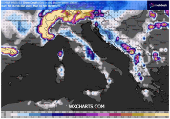 In tale contesto, le precipitazioni associate all’ingresso perturbato potrebbero risultare nevose fino a quote collinari sulle Alpi, con possibili episodi anche in pianura laddove si instaurassero condizioni favorevoli come rovesci intensi o effetti di stau da rientro freddo. Sull’Appennino centrale e settentrionale la quota neve potrebbe scendere fino a 700–900 metri, con sconfinamenti a bassa quota nelle valli interne o in caso di nuclei precipitativi ben strutturati.