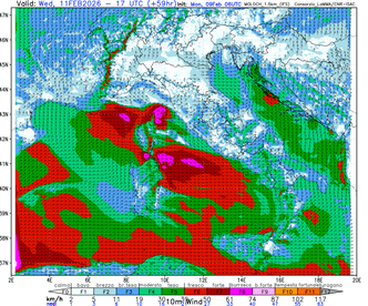 Una fase meteorologica fortemente perturbata è attesa sull’Italia tra Mercoledì 11 e Venerdì 13 Febbraio, con l’ingresso di un intenso flusso di correnti occidentali che determinerà condizioni di marcata instabilità atmosferica e, soprattutto, venti di burrasca su vaste porzioni del territorio nazionale. L’evoluzione sinottica evidenzia un deciso approfondimento del gradiente barico tra l’Europa occidentale e il Mediterraneo centrale, con il transito di una serie di impulsi perturbati associati a una saccatura atlantica in discesa verso la penisola iberica. Il risultato sarà un regime di forti correnti sud-occidentali, in quota e al suolo, che investiranno in pieno l’Italia centro-meridionale, con effetti particolarmente significativi sul comparto tirrenico.