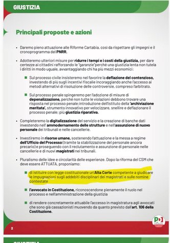 Eppure, quei contenuti meriterebbero ben altra attenzione. La separazione delle carriere tra giudici e pubblici ministeri, per esempio, è un tema di vecchia data, che ha attraversato trasversalmente la politica italiana. Non è solo una bandiera del centrodestra: il Partito Democratico, fino a pochi anni fa, guardava con favore a un rafforzamento delle garanzie di terzietà nel processo penale. Nel programma elettorale del 2022 — quello del partito oggi guidato da Schlein — si leggeva testualmente la proposta di “istituire con legge costituzionale un’Alta Corte competente a giudicare le impugnazioni sugli addebiti disciplinari dei magistrati e sulle nomine contestate“. Una proposta che si muoveva chiaramente nella direzione di un sistema più bilanciato tra poteri e funzioni.