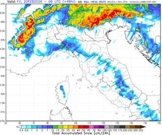 In montagna si prospetta invece un evento di rilievo. Lungo l’intero arco alpino, dalle Alpi occidentali alle Dolomiti, sono attesi accumuli abbondanti: al di sopra dei 1500-1800 metri si prevedono apporti superiori ai 30 centimetri di neve fresca nell’arco di 24 ore, con punte localmente superiori sui settori di confine. Anche l’Appennino settentrionale sarà interessato da nevicate, in particolare intorno ai 1000 metri tra Liguria ed Emilia, dove l’intensità dei fenomeni potrà favorire accumuli moderati.