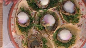 - Assemblaggio e servizio: aprire delicatamente i carciofi cotti, adagiarli caldi su un piatto. Mettere al centro di ciascun carciofo un'uovo sgusciata (intera) o, se preferite, tagliata a metà per mostrare il tuorlo cremoso. Aggiungere accanto un cestino di parmigiano ripieno di rucola condita. Completare con un filo d'olio a crudo, una macinata di pepe e, se necessario, un pizzico di sale sul tuorlo. Servire subito, ben caldi.