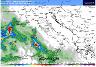 Nel corso della giornata il fronte tenterà di spostarsi verso est, ma l’alta pressione ostacolerà l’avanzata, mantenendo le condizioni piovose soprattutto sulle due isole maggiori. Qualche debole precipitazione potrà interessare anche il settore più meridionale della Calabria.