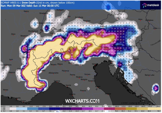 La prima fase del peggioramento interesserà le regioni settentrionali nella giornata di sabato 14 marzo. L’ingresso del sistema perturbato sarà accompagnato da un’intensa attività precipitativa, con piogge diffuse e a tratti persistenti su gran parte del Nord. L’elemento più rilevante sarà rappresentato tuttavia dalle nevicate attese sull’arco alpino. In particolare, il settore dolomitico risulterà tra le aree maggiormente coinvolte, dove le proiezioni modellistiche indicano accumuli nevosi potenzialmente molto abbondanti. Alle quote più elevate gli apporti di neve fresca potrebbero superare localmente i 50 centimetri, con condizioni pienamente invernali sulle principali località sciistiche. L’esatta quota neve sarà definita con maggiore precisione nei prossimi aggiornamenti previsionali, ma allo stato attuale si prevede un limite generalmente collocato a partire dai 1500 metri, con possibili abbassamenti nelle fasi più intense delle precipitazioni.