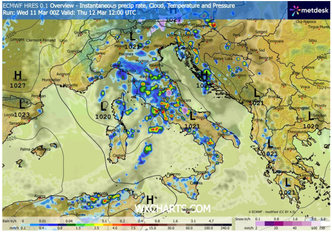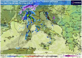 Una insidiosa depressione atmosferica si sposterà nelle prime ore di giovedì 12 marzo dal Mar Ligure verso l’alto Tirreno, trascinando con sé rovesci e temporali a carattere sparso su gran parte della penisola. Il sistema origina dalla discesa di un fronte perturbato dalla Francia verso il bacino centro-occidentale del Mediterraneo.