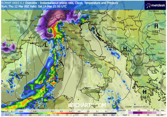 Nella giornata di sabato 14, il minimo barico si posizionerà tra la Provenza e il Mar Ligure. Le aree più colpite saranno il Piemonte, la Liguria e parte della Lombardia, dove sono attese precipitazioni diffuse e localmente abbondanti. Venti forti tra Libeccio e Scirocco interesseranno i bacini occidentali, mentre sull’estremo nord-ovest l’aria più fredda in quota favorirà rovesci intensi, abbondanti nevicate sulle Alpi e locali colpi di vento.