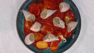 Totani ripieni al sugo: un secondo di mare che unisce il profumo della scarola, la sapidità delle acciughe e dei capperi e la dolcezza del pomodoro, con la morbidezza dei totani e la croccantezza del pangrattato. La versione di Mauro e Mattia Improta è rustica ma raffinata: comoda da preparare, perfetta per una cena in famiglia o per sorprendere gli ospiti. In questa ricetta i totani vengono farciti con un ripieno saporito a base di scarola, gamberetti e acciughe, poi rosolati e serviti su un letto di patate al sugo che completa il piatto con un tocco casalingo.