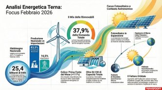 Il mese di febbraio segna un deciso balzo in avanti sul fronte delle fonti rinnovabili. Secondo i dati di Terna, le energie verdi hanno coperto il 37,9% della domanda elettrica nazionale, in forte aumento rispetto al 30,3% registrato nello stesso mese del 2025. La produzione complessiva da fonti rinnovabili è cresciuta del 27,8%, trainata in modo determinante dall’eolico, che si è affermato come prima fonte di generazione del mese.