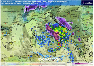 Questa sequenza perturbata si inserisce in un contesto atmosferico più ampio, già caratterizzato da una profonda riorganizzazione della circolazione su scala continentale. Tra il 20 e il 25 marzo una prima saccatura proveniente dalla Penisola Iberica si è già diretta verso il Tirreno, isolando una depressione a ovest dell’Italia e portando piogge e temporali soprattutto al Centro-Nord. La settimana del 25-30 rappresenterà quindi la fase più intensa e prolungata di questa sequenza depressionaria, con più sistemi ciclonali che si succederanno a brevissima distanza temporale. Il meccanismo alla base è l’interazione tra la corrente a getto polare, molto ondulata, e la corrente a getto subtropicale che scorre sopra il Nord Africa: da questa dinamica si sviluppano i cicloni extratropicali che poi si incanalano verso il Mediterraneo.