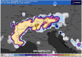 Domenica 22 marzo il sistema perturbato traslerà verso ovest, coinvolgendo in maniera più diretta l’arco alpino occidentale. I settori piemontesi saranno i più esposti, con nevicate che potranno spingersi fino ai 600-700 metri grazie a un ulteriore raffreddamento della colonna d’aria. Le precipitazioni, pur non configurandosi come eccezionali, risulteranno persistenti e in grado di garantire accumuli significativi alle quote medio-alte.