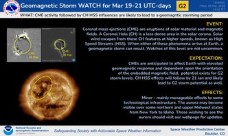 Gli esperti dello Space Weather Prediction Center (SWPC) della NOAA hanno diramato un’allerta per l’arrivo di una tempesta geomagnetica moderata di classe G2 tra giovedì 19 e sabato 21 marzo 2026. Il fenomeno potrebbe interessare la Terra con effetti sulla rete elettrica, sulle operazioni satellitari e sulle comunicazioni radio.