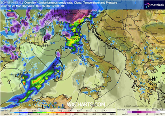 Una breve finestra di miglioramento è attesa tra lunedì 23 e martedì 24 marzo, con cieli prevalentemente soleggiati e condizioni più gradevoli. Si tratterà tuttavia di una pausa temporanea. A partire dalla serata di mercoledì 25, una nuova e più intensa perturbazione prenderà forma con la strutturazione di un ciclone che porterà maltempo diffuso al Nord, sulla Toscana, Umbria, Lazio, Marche e in serata su Sicilia e Campania. Le precipitazioni potranno risultare localmente abbondanti, con temporali, grandinate e nevicate a quote via via più basse.