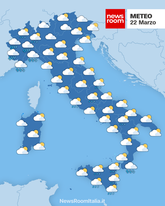 Italia – Una circolazione di bassa pressione interessa gran parte della Penisola per la giornata di domenica 22 marzo, con valori barometrici contenuti e dinamiche instabili. Le temperature massime si attesteranno in genere tra 8°C e 16°C; mattinate perturbate al Nordovest con nevicate significative sui rilievi piemontesi sopra i 600 m, piogge irregolari sulla Liguria di Ponente. Nel corso del pomeriggio la fenomenologia tenderà a ridimensionarsi a Nordovest ma ad intensificarsi sul Centro e Sud, con rovesci, locali temporali e accumuli nevosi sugli Appennini oltre circa 1200 m.