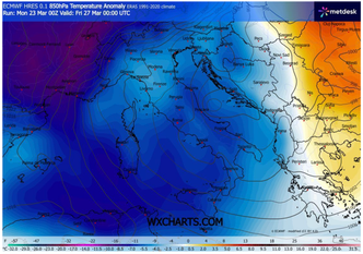 Si tratta di uno dei classici colpi di coda invernali che caratterizzano le prime settimane di primavera: una dinamica tutt’altro che rara, ma che in questo caso si preannuncia particolarmente intensa per via dell’ampiezza del calo termico atteso.
