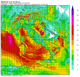 Giovedì 26 marzo è la giornata più critica.Con l’occhio del ciclone posizionato sul medio Adriatico, tra Marche, Abruzzo e Molise, i venti sulle coste adriatiche raggiungeranno il picco con raffiche superiori ai 130-150 km/h. In serata si potrebbero registarre valori oltre i 150 km/h in Molise. Un forte maestrale investirà la Sardegna e il Tirreno fin dalle prime ore del mattino, mentre il foehn alpino si intensificherà sulle vallate del Nord. Nel corso della mattinata Romagna e Marche vengono colpite direttamente dall’occhio del ciclone, con raffiche eccezionali ad Ancona. Nel pomeriggio la perturbazione si estenderà a Campania, Puglia, Basilicata, Calabria e Sicilia orientale, con temporali violenti, grandine abbondante e raffiche di burrasca.