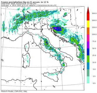 Mercoledì sera, a partire dalle ore 18-19, il fronte freddo sfinderà sulle Alpi portando forti temporali e rischio grandinate nella pianura Padana centro-orientale, con particolare intensità su Triveneto ed Emilia-Romagna. La neve è scesa copiosa fin sotto i 500-600 metri in serata. Il vento ha raggiunto raffiche di 100-120 km/h in pianura su Liguria, Piemonte e Lombardia. Le aree più esposte saranno le province di Brescia, Verona, Padova, Vicenza, Treviso, Venezia, Udine, Trieste, Mantova, Ferrara, Bologna e Rimini. La forte shear verticale e la presenza di aria gelida in quota creeranno le condizioni favorevoli per la formazione di temporali supercellulari con alto rischio tornado in Pianura Padana orientale e Veneto, oltre che per grandine di medie e grandi dimensioni.