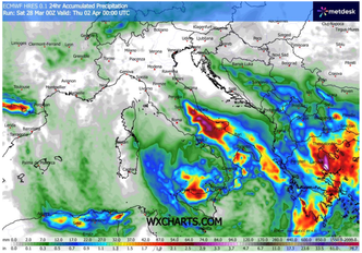 Tra il 31 marzo e il 3 aprile sono attesi quattro giorni consecutivi di maltempo diffuso e localmente estremo. Le precipitazioni risulteranno particolarmente abbondanti sulle regioni adriatiche e su gran parte del Sud Italia, con accumuli che, secondo le attuali stime, potranno superare i 100-150 mm in diverse aree, con picchi superiori sui settori esposti allo stau. Il rischio idrogeologico sarà elevato, soprattutto in presenza di terreni già saturi per le piogge pregresse.