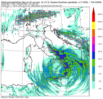 Nel corso del pomeriggio e della sera, il ciclone entrerà in fase di piena organizzazione sul basso Tirreno, determinando un sensibile incremento dell’instabilità su tutto il Centro-Sud. Le regioni maggiormente esposte saranno Abruzzo, Molise, Puglia, Basilicata, Calabria e Sicilia, dove si prevedono piogge persistenti a carattere di rovescio o temporale, con cumulati localmente superiori ai 300–350 mm nell’arco dei quattro giorni.