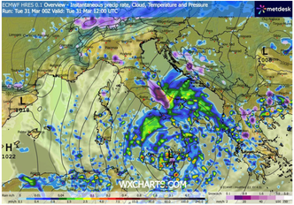 Nelle ore mattutine e fino al primo pomeriggio del 31 marzo, il Nord Italia risulta in gran parte al riparo dai fenomeni più intensi: residui rovesci interessano ancora l’Emilia Romagna, mentre qualche nevicata è presente sulle creste alpine di confine. Tempo in miglioramento anche su Toscana, Umbria occidentale e Lazio, con nubi sparse e precipitazioni solo sporadiche. Sul resto d’Italia imperversa invece il maltempo, con piogge diffuse, rovesci e temporali; il settore ionico è quello meno colpito. Le nevicate raggiungono quote comprese tra 800 e 1000 metri sull’Appennino Marchigiano e Abruzzese, tra 1000 e 1200 metri sul resto del Meridione peninsulare e intorno ai 1400 metri in Sicilia.