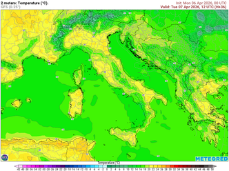 Nord: Sulle regioni settentrionali la giornata sarà caratterizzata da stabilità e ampie aperture: il cielo si presenterà per lo più sereno o al massimo poco nuvoloso, senza fenomeni di rilievo. La pressione rimarrà elevata e contribuirà a condizioni di tempo asciutto. I venti soffieranno deboli da direzioni variabili, con locali modesti rinforzi lungo le coste e nei bacini prealpini; i mari saranno in prevalenza calmi. Le temperature subiranno un ulteriore incremento rispetto ai giorni precedenti: massime diffuse intorno a 23-26°C nelle pianure interne e sui fondovalle, più contenute lungo le coste (ad esempio Genova intorno ai 15°C mentre molte città non costiere raggiungeranno i 24-27°C). Minime generalmente comprese fra 8°C e 12°C, più basse in aree interne e di alta quota.