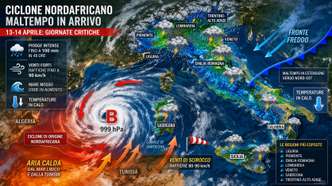 Il ciclone attraverserà il Canale di Sardegna già dalla giornata di domenica 12 aprile, richiamando impetuosi venti di scirocco provenienti dal Mar Libico e dalla Tunisia verso le isole maggiori e il meridione. Sulla Sicilia e sulla Calabria sono già previste per domenica raffiche superiori agli 80-90 km/h, con condizioni marine in rapido deterioramento e moto ondoso in aumento.