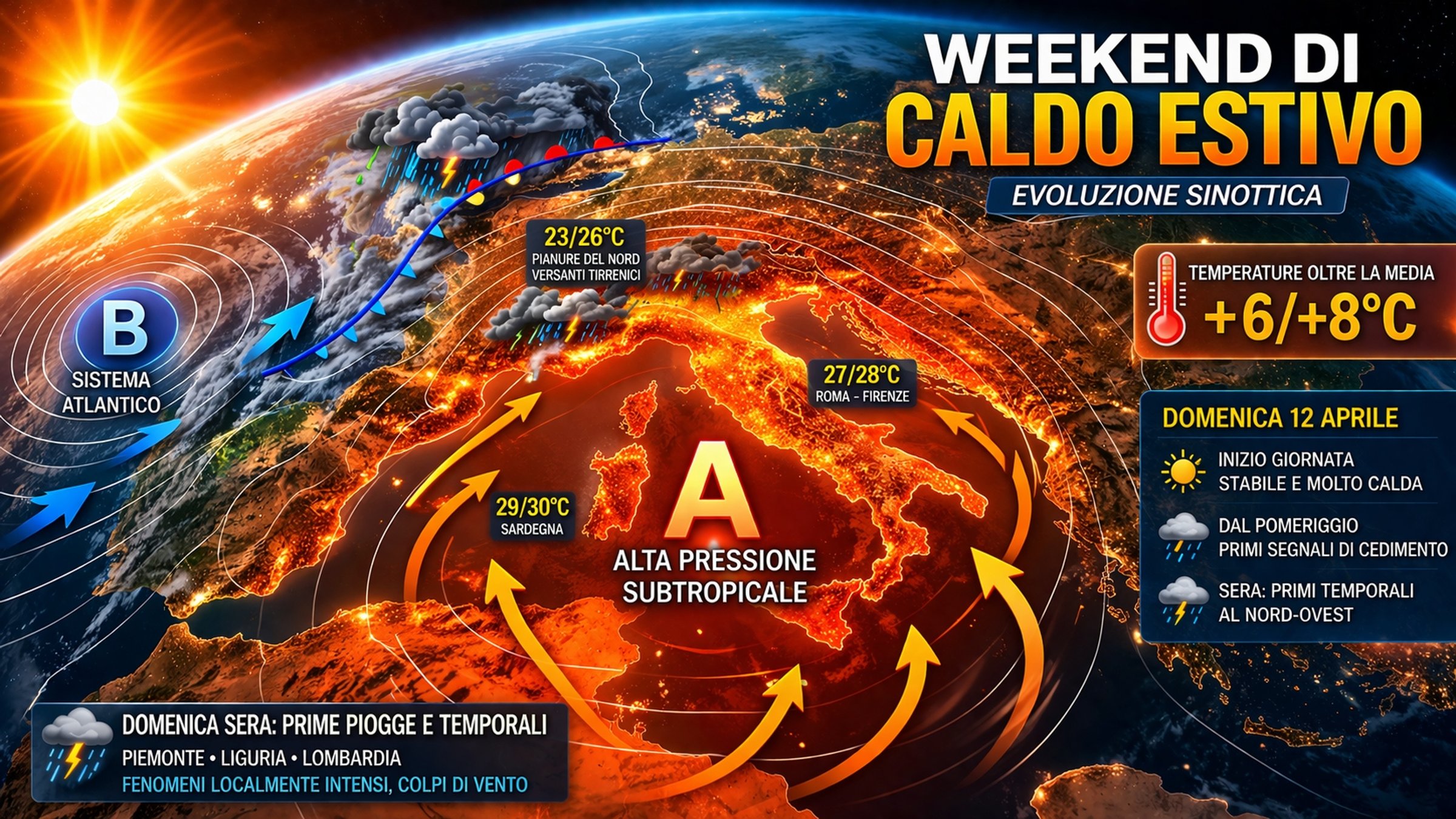 La giornata di Domenica 12 Aprile rappresenterà il culmine di questa fase anticiclonica, con condizioni inizialmente stabili e temperature ulteriormente elevate soprattutto sulle regioni del Centro-Sud. Tuttavia, nel corso delle ore si osserveranno i primi segnali di cedimento della struttura altopressoria. L’avvicinamento di un sistema perturbato di origine nord-atlantica determinerà una progressiva erosione del geopotenziale in quota, favorendo l’ingresso di correnti più fresche e instabili.