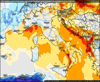 Al Sud la diminuzione sarà più contenuta, a causa della ventilazione meridionale associata alla circolazione ciclonica, con venti di Scirocco che contribuiranno a mantenere valori relativamente più elevati, pur in un contesto di instabilità diffusa e precipitazioni intermittenti.