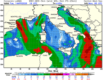 A partire da martedì 14 aprile si entrerà nella fase più intensa del peggioramento. Il minimo barico, in progressivo approfondimento, determinerà un deciso calo della pressione al suolo e un conseguente rinforzo del gradiente barico, responsabile dell’attivazione di venti sostenuti su gran parte della Penisola. Il Mar Tirreno agirà da serbatoio energetico, favorendo l’innesco di celle temporalesche anche di forte intensità.
