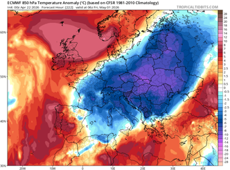 Il segnale più netto arriva dalle temperature in quota, che risultano inferiori alle medie del periodo e confermano un’atmosfera più instabile. In particolare, per l’Italia si stimano valori intorno ai 10-12°C al Nord, con punte localmente un po’ più basse a ridosso dei rilievi; 12-14°C al Centro, soprattutto sul lato tirrenico; 11-13°C sul medio Adriatico; 14-16°C al Sud peninsulare; 16-18°C tra Sicilia, Calabria ionica e localmente sulle Isole maggiori. Sulle Alpi, invece, i valori scendono sensibilmente, con temperature comprese in molti casi tra 0 e 4°C, a conferma di un contesto decisamente più fresco in montagna.
