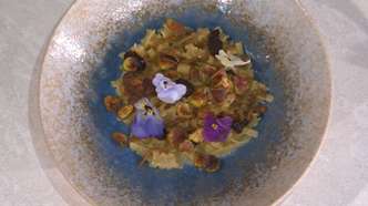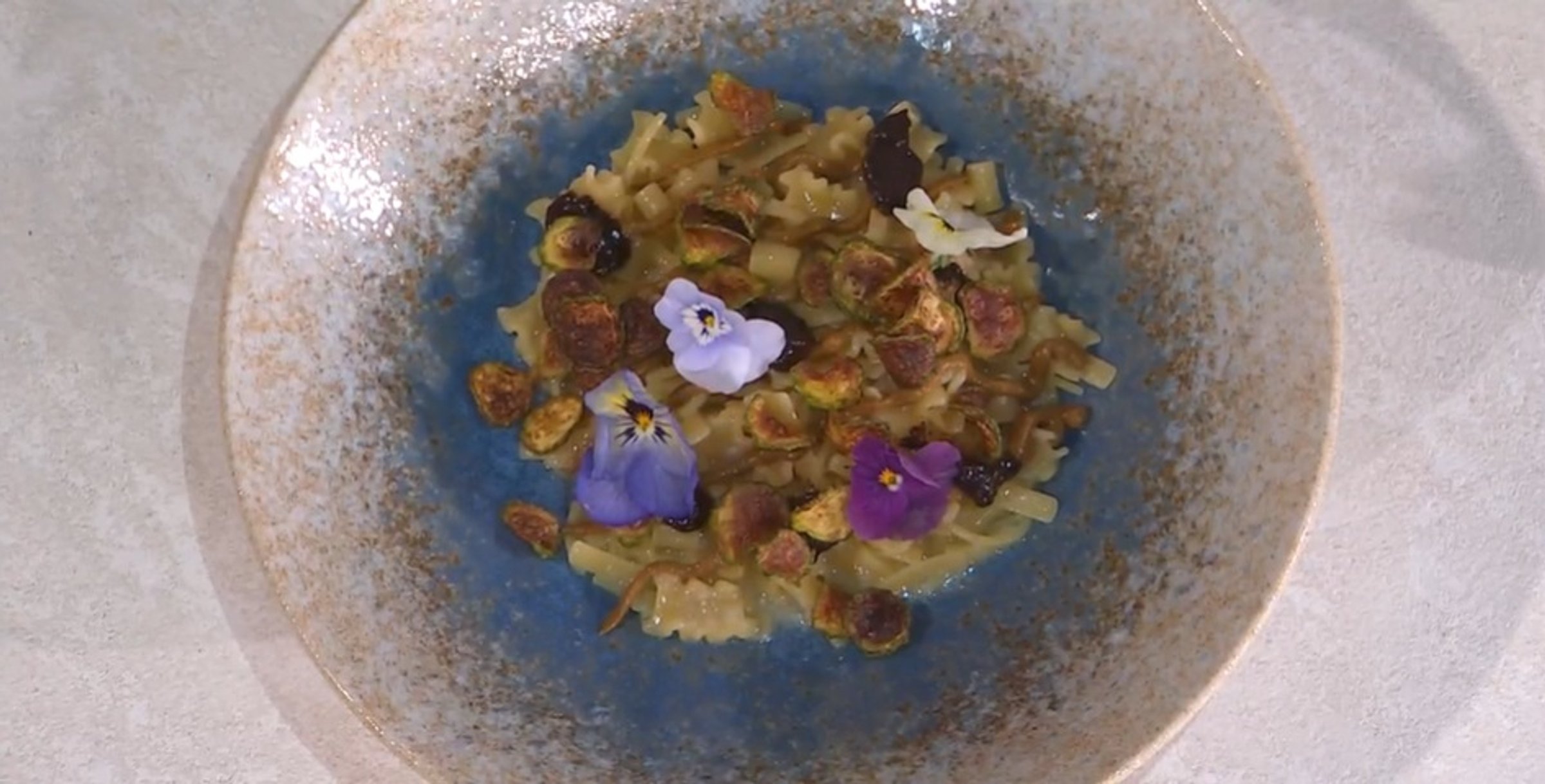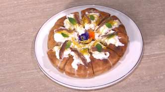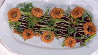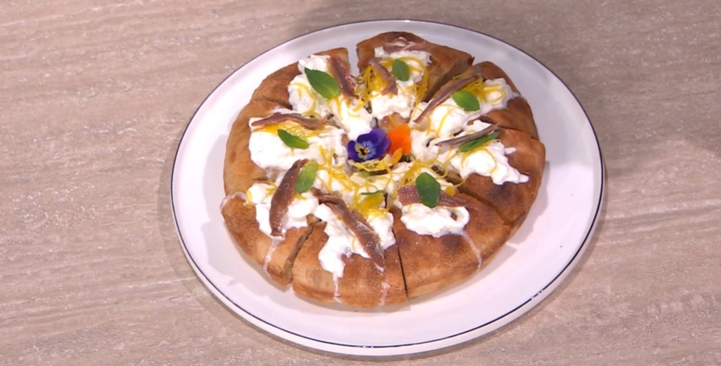 David Fiordigiglio propone un secondo goloso e scenografico: sovracosce di pollo cotte con la pelle croccante, servite con un intenso fondo bruno, maionese fatta in casa al fondo di pollo, punte di asparagi saltate e anelli di cipolla croccanti. È un piatto che gioca sui contrasti di consistenze — pelle croccante, maionese setosa, anelli volutamente friabili e asparagi teneri — e sui sapori decisi, perfetto per una tavola di primavera, anche all’aperto durante una gita o un pranzo in famiglia.