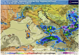 Contestualmente, l’instabilità tenderà a propagarsi verso il Centro Italia e la Sardegna settentrionale, con temporali sparsi. Nei giorni immediatamente successivi, tra il 29 e il 30 aprile, il fronte instabile scivolerà ulteriormente verso sud, coinvolgendo la Puglia e gran parte del Sud. Questa fase sarà accompagnata da un’irruzione di aria fredda che determinerà un sensibile calo delle temperature, con effetti evidenti anche sull’area balcanica, dove sono attese nevicate sui rilievi.