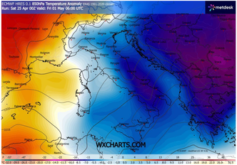 A partire dalla seconda parte della prima settimana di maggio, l’assetto atmosferico tornerà a destabilizzarsi. L’ingresso di correnti più fredde in quota riattiverà la convezione, in particolare sulle aree interne della Penisola, dove si svilupperanno nuovi episodi temporaleschi pomeridiani.