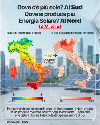 È qui che il paradosso energetico italiano diventa politico oltre che industriale. Il Nord continua a correre grazie a una maggiore densità produttiva, a consumi elettrici più elevati, a una struttura imprenditoriale più capillare e a una diffusione più ampia di impianti su tetti industriali e commerciali. Il Sud, pur disponendo di una radiazione solare più favorevole, non trasforma ancora in modo proporzionale questo vantaggio naturale in capacità installata. Il risultato è un Paese in cui il territorio con il miglior irraggiamento non coincide ancora con quello che attrae più investimenti e più connessioni nel fotovoltaico, mentre sull’eolico la geografia resta quasi ribaltata e fortemente sbilanciata verso il Mezzogiorno, come mostrano da anni le statistiche del settore.