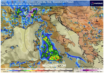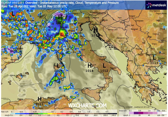 Già dalla giornata di lunedì 4 maggio, una profonda saccatura atlantica affonderà verso l’Europa occidentale convogliando aria umida e più fresca verso la Penisola. Il rapido approfondimento del minimo barico associato determinerà la formazione di un sistema frontale organizzato, in grado di coinvolgere soprattutto le regioni centro-settentrionali. In questa fase iniziale, l’elemento di maggiore rilievo sarà rappresentato dall’elevato contenuto energetico disponibile: le temperature superficiali marine già relativamente miti, unite al richiamo di correnti meridionali nei bassi strati, favoriranno lo sviluppo di convezione intensa.